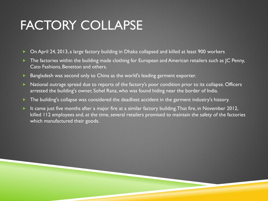 Factory collapse • On April 24, 2013, a large factory building in Dhaka collapsed and killed at least 900 workers • The factories within the building made clothing for European and American retailers such as JC Penny, Cato Fashions, Benetton and others. • Bangladesh was second only to China as the world's leading garment exporter. • National outrage spread due to reports of the factory’s poor condition prior to its collapse. Officers arrested the building's owner, SohelRana, who was found hiding near the border of India. • The building's collapse was considered the deadliest accident in the garment industry's history. • It came just five months after a major fire at a similar factory building. That fire, in November 2012, killed 112 employees and, at the time, several retailers promised to maintain the safety of the factories which manufactured their goods.