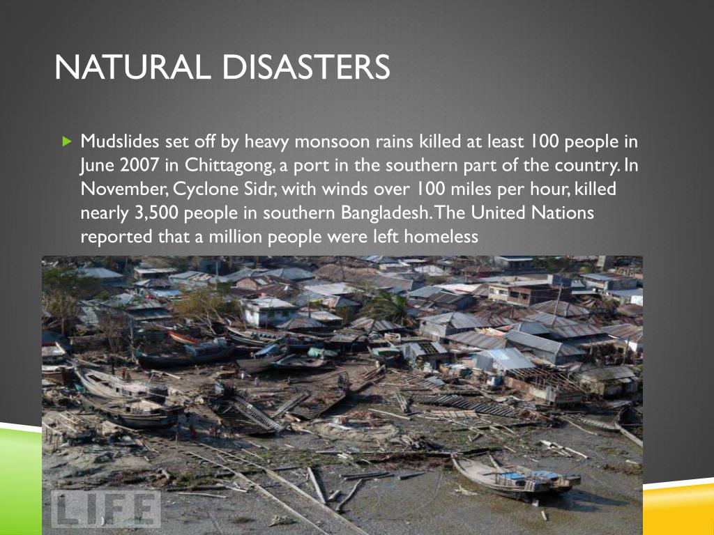 Natural DIsasters • Mudslides set off by heavy monsoon rains killed at least 100 people in June 2007 in Chittagong, a port in the southern part of the country. In November, Cyclone Sidr, with winds over 100 miles per hour, killed nearly 3,500 people in southern Bangladesh. The United Nations reported that a million people were left homeless