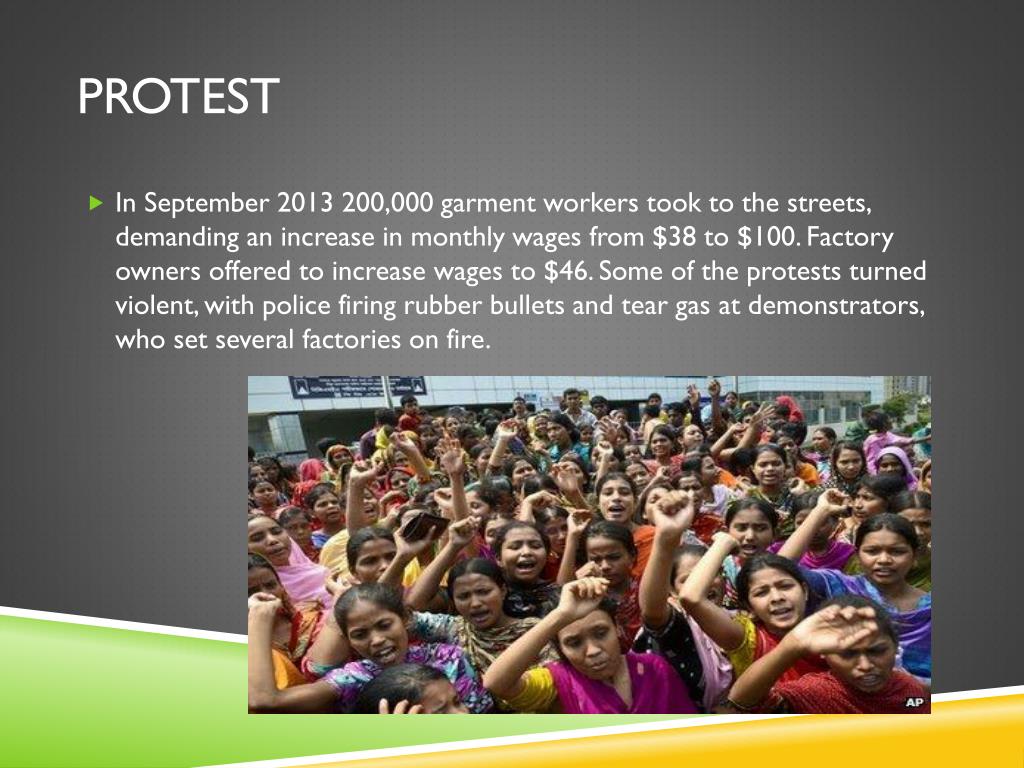 Protest • In September 2013 200,000 garment workers took to the streets, demanding an increase in monthly wages from $38 to $100. Factory owners offered to increase wages to $46. Some of the protests turned violent, with police firing rubber bullets and tear gas at demonstrators, who set several factories on fire.