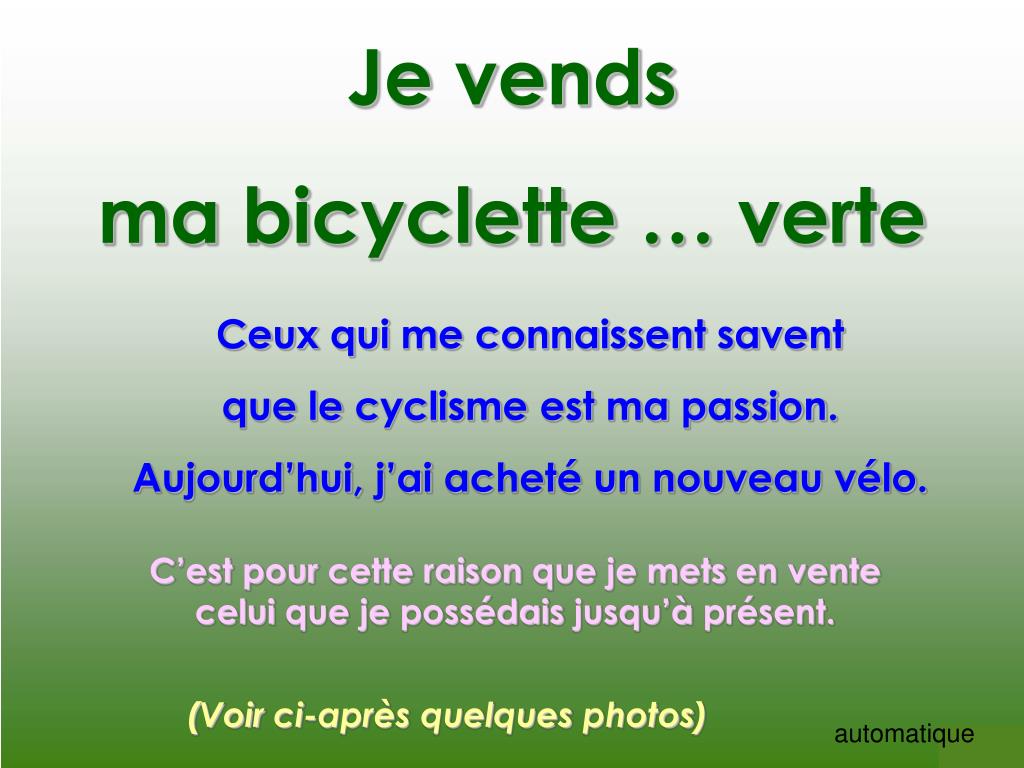 Je vends mabicyclette … verte Ceuxqui me connaissentsavent que le cyclismeestmapassion. Aujourd’hui, j’aiacheté un nouveauvélo. C’estpourcetteraison que je mets en vente celui que je possédaisjusqu’àprésent. (Voirci-aprèsquelquesphotos) automatique