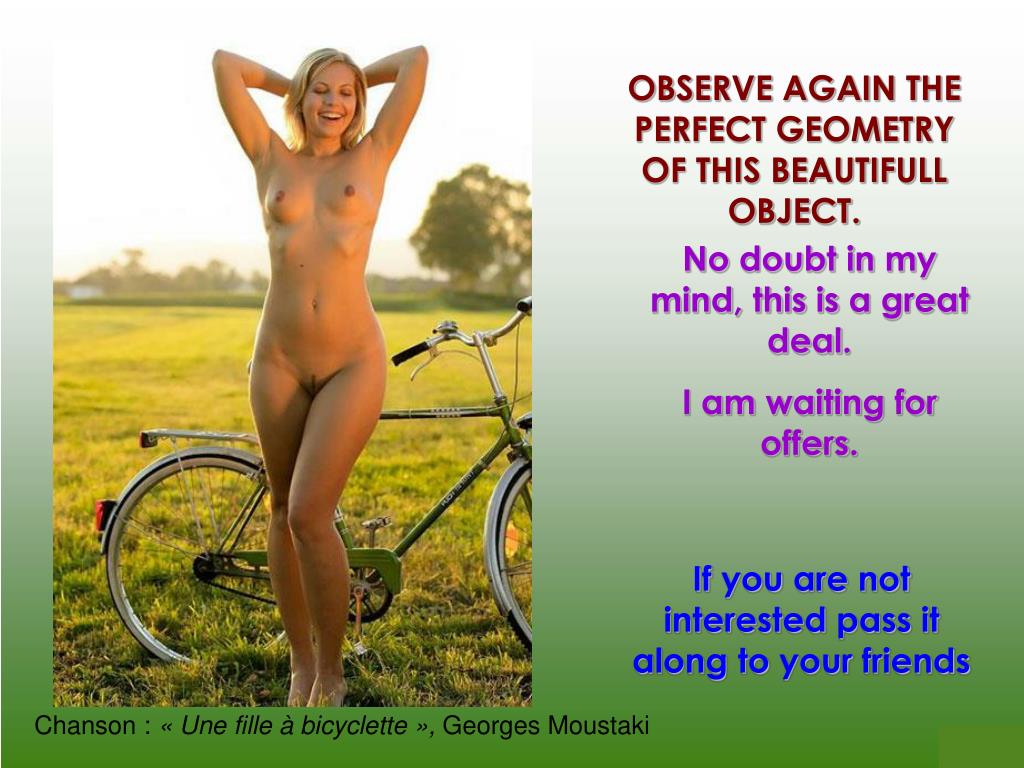 OBSERVE AGAIN THE PERFECT GEOMETRY OF THIS BEAUTIFULL OBJECT. No doubt in mymind, thisis a greatdeal. I am waitingforoffers. Ifyou are notinterestedpassitalongtoyourfriends Chanson : « Une fille à bicyclette », Georges Moustaki