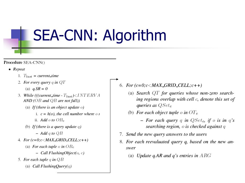 SEA-CNN: Incremental Search • Key points: • For each query q, define a search region based on past answer and recent movements of q and objects. • Only objects inside search region are checked against q. • Given q.ARt0 as the answer radius of q at time t0 (q.AR = distance from q to kth-NN object) At time t1, the search radius of query q (q.SRt1) is computed as follows: • Step 1: check if any object moves in q.ARt0 during [t0, t1]. If yes, q.SRt1 = q. ARt0. If no, q.SRt1 = 0. • Step 2: check if any object that was in q.ARt0 but moves out of q.ARt0 during [t0, t1]. If yes, q.SRt1 equals the distance from q to the furthest object. • Step 3: check if q moves during [t0, t1]. If yes: • If q. SRt1 =0 then q.SRt1 = q.ARt0 + |q.Loct1- q.Loct0| • If q. SRt1 !=0 then q.SRt1 = q. SRt1 + |q.Loct1- q.Loct0|