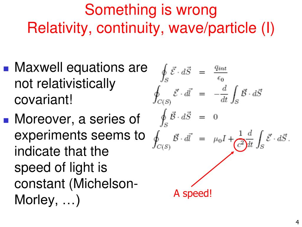 Something is wrongRelativity, continuity, wave/particle (I) • Maxwell equations are not relativistically covariant! • Moreover, a series of experiments seems to indicate that the speed of light is constant (Michelson-Morley, …) A speed!