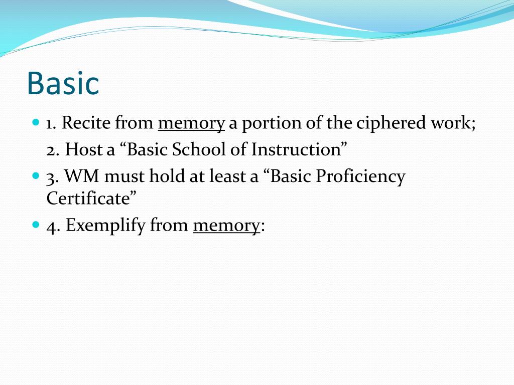 Basic • 1. Recite from memory a portion of the ciphered work; 2. Host a “Basic School of Instruction” • 3. WM must hold at least a “Basic Proficiency Certificate” • 4. Exemplify from memory: