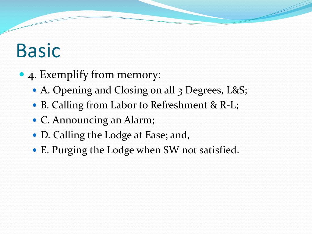 Basic • 4. Exemplify from memory: • A. Opening and Closing on all 3 Degrees, L&S; • B. Calling from Labor to Refreshment & R-L; • C. Announcing an Alarm; • D. Calling the Lodge at Ease; and, • E. Purging the Lodge when SW not satisfied.