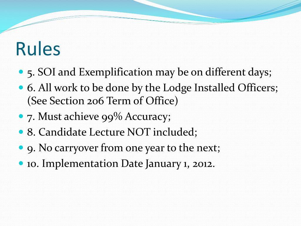 Rules • 5. SOI and Exemplification may be on different days; • 6. All work to be done by the Lodge Installed Officers; (See Section 206 Term of Office) • 7. Must achieve 99% Accuracy; • 8. Candidate Lecture NOT included; • 9. No carryover from one year to the next; • 10. Implementation Date January 1, 2012.