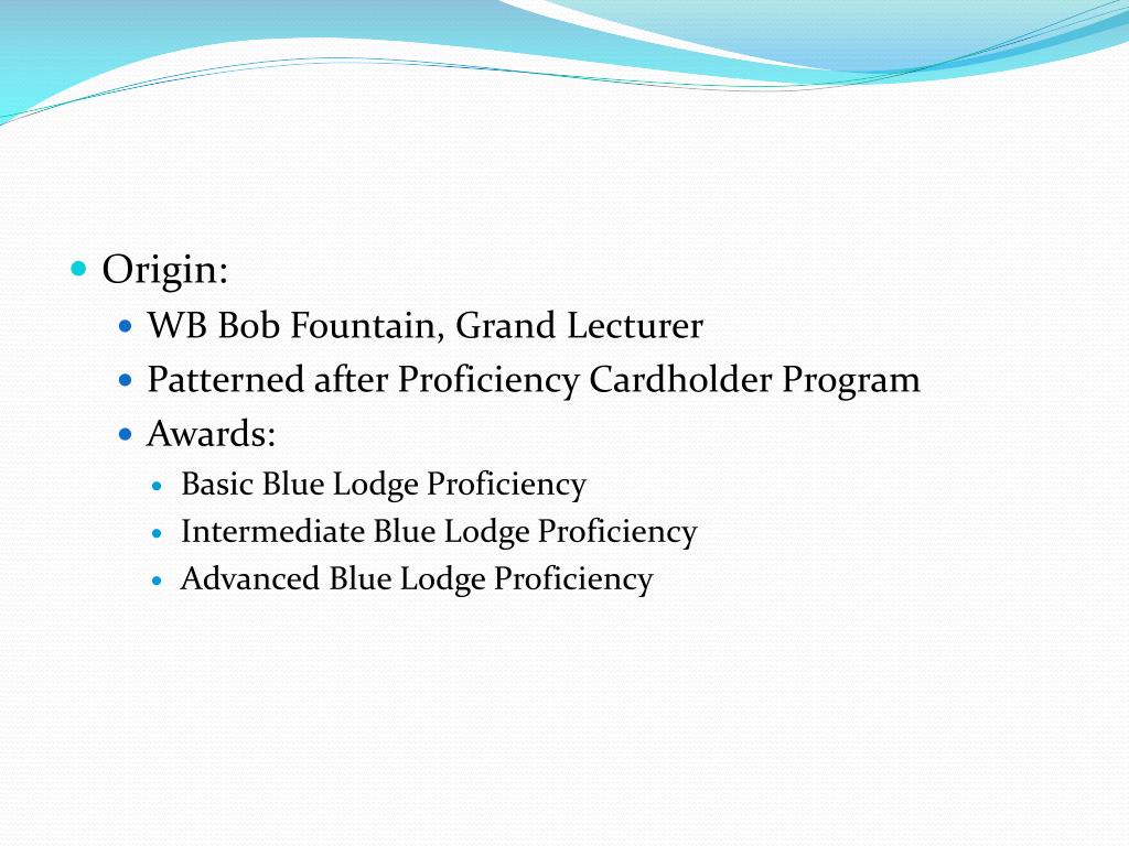 Origin: • WB Bob Fountain, Grand Lecturer • Patterned after Proficiency Cardholder Program • Awards: • Basic Blue Lodge Proficiency • Intermediate Blue Lodge Proficiency • Advanced Blue Lodge Proficiency