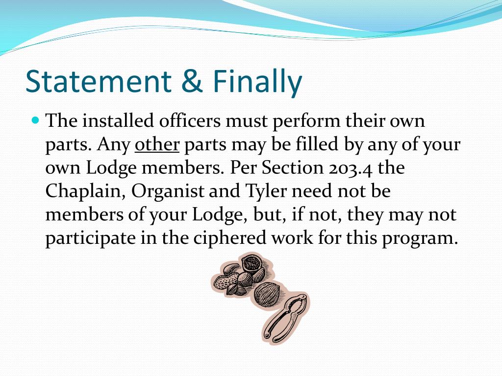 Statement & Finally • The installed officers must perform their own parts. Any other parts may be filled by any of your own Lodge members. Per Section 203.4 the Chaplain, Organist and Tyler need not be members of your Lodge, but, if not, they may not participate in the ciphered work for this program.