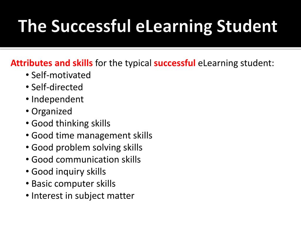 The Successful eLearning Student • Attributes and skills for the typical successful eLearning student: • Self-motivated • Self-directed • Independent • Organized • Good thinking skills • Good time management skills • Good problem solving skills • Good communication skills • Good inquiry skills • Basic computer skills • Interest in subject matter