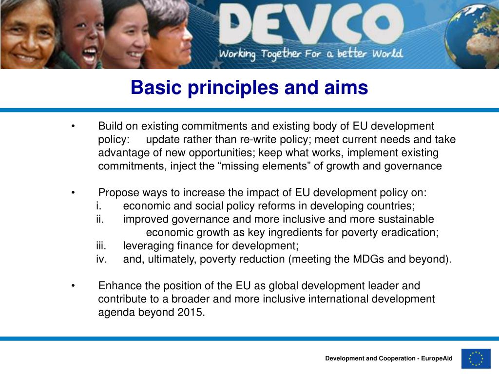 Basic principles and aims • Build on existing commitments and existing body of EU development policy: update rather than re-write policy; meet current needs and take advantage of new opportunities; keep what works, implement existing commitments, inject the “missing elements” of growth and governance • Propose ways to increase the impact of EU development policy on: • economic and social policy reforms in developing countries; • improved governance and more inclusive and more sustainable economic growth as key ingredients for poverty eradication; • leveraging finance for development; • and, ultimately, poverty reduction (meeting the MDGs and beyond). • Enhance the position of the EU as global development leader and contribute to a broader and more inclusive international development agenda beyond 2015.