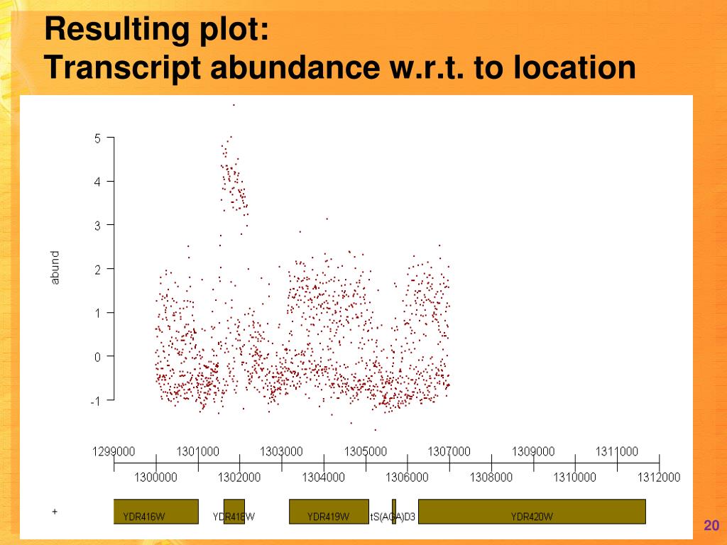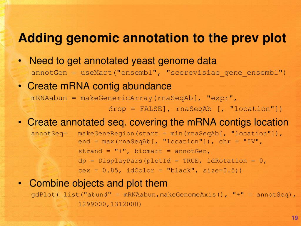 Adding genomic annotation to the prev plot • Need to get annotated yeast genome data annotGen = useMart("ensembl", "scerevisiae_gene_ensembl") • Create mRNA contig abundance mRNAabun = makeGenericArray(rnaSeqAb[, "expr", drop = FALSE], rnaSeqAb [, "location"]) • Create annotated seq. covering the mRNA contigs location annotSeq= makeGeneRegion(start = min(rnaSeqAb[, "location"]), end = max(rnaSeqAb[, "location"]), chr = "IV", strand = "+", biomart = annotGen, dp = DisplayPars(plotId = TRUE, idRotation = 0, cex = 0.85, idColor = "black", size=0.5)) • Combine objects and plot them gdPlot( list("abund" = mRNAabun,makeGenomeAxis(), "+" = annotSeq), 1299000,1312000)