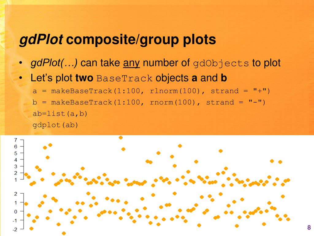 gdPlot composite/group plots • gdPlot(…) can take any number of gdObjects to plot • Let’s plot twoBaseTrack objects a and b a = makeBaseTrack(1:100, rlnorm(100), strand = "+") b = makeBaseTrack(1:100, rnorm(100), strand = "-") ab=list(a,b) gdplot(ab)