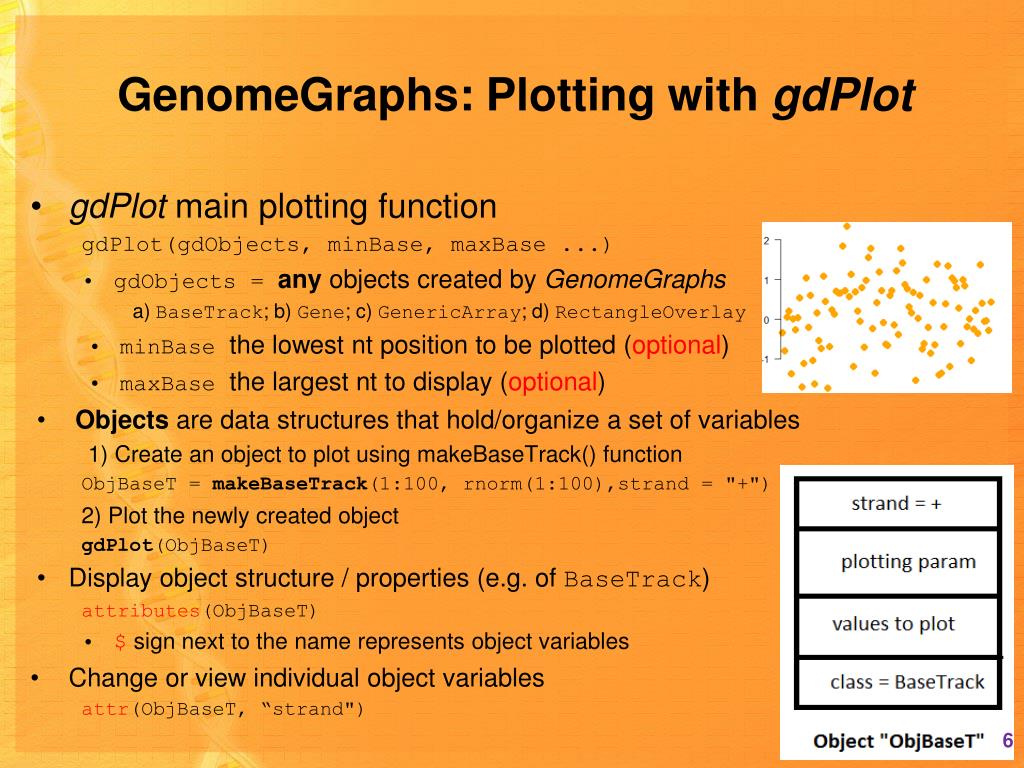GenomeGraphs: Plotting with gdPlot • gdPlotmain plotting function gdPlot(gdObjects, minBase, maxBase ...) • gdObjects = any objects created by GenomeGraphs a) BaseTrack; b) Gene; c) GenericArray; d) RectangleOverlay • minBasethe lowest nt position to be plotted (optional) • maxBasethe largest nt to display (optional) • Objects are data structures that hold/organize a set of variables 1) Create an object to plot using makeBaseTrack() function ObjBaseT = makeBaseTrack(1:100, rnorm(1:100),strand = "+") 2) Plot the newly created object gdPlot(ObjBaseT) • Display object structure / properties (e.g. of BaseTrack) attributes(ObjBaseT) • $ sign next to the name represents object variables • Change or view individual object variables attr(ObjBaseT, “strand")