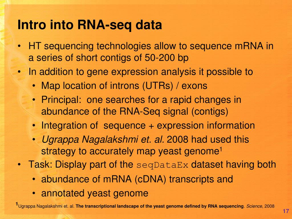 Intro into RNA-seq data 1Ugrappa Nagalakshmi et. al. The transcriptional landscape of the yeast genome defined by RNA sequencing. Science, 2008 • HT sequencing technologies allow to sequence mRNA in a series of short contigs of 50-200 bp • In addition to gene expression analysis it possible to • Map location of introns (UTRs) / exons • Principal: one searches for a rapid changes in abundance of the RNA-Seq signal (contigs) • Integration of sequence + expression information • Ugrappa Nagalakshmi et. al. 2008 had used this strategy to accurately map yeast genome1 • Task: Display part of the seqDataEx dataset having both • abundance of mRNA (cDNA) transcripts and • annotated yeast genome