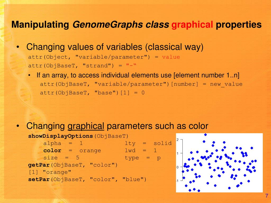 Manipulating GenomeGraphs classgraphical properties • Changing values of variables (classical way) attr(Object, "variable/parameter") = value attr(ObjBaseT, "strand") = "-“ • If an array, to access individual elements use [element number 1..n] attr(ObjBaseT, "variable/parameter")[number] = new_value attr(ObjBaseT, "base")[1] = 0 • Changing graphical parameters such as color showDisplayOptions(ObjBaseT) alpha = 1 lty = solid color= orange lwd= 1 size = 5 type = p getPar(ObjBaseT, "color") [1] "orange" setPar(ObjBaseT, "color", "blue")