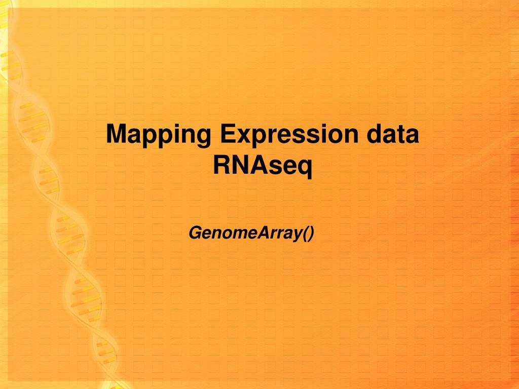 Plotting RNA-seq data with GenomeArray() • Need to get mRNA contig abundance data data("seqDataEx") rnaSeqAb=seqDataEx$david • Create GeneticArray object with makeGenericArray(intensity, probeStart, probeEnd, trackOverlay, dp = NULL) • intensity either microaray or RNAseq transcript abundance signal • probStart start position of the probe (location in nt) • Plot contig abundance w.r.t. to genomic location gdPlot(list("abun"=makeGenericArray(rnaSeqAb[, "expr", drop = FALSE], rnaSeqAb[, "location"]) , makeGenomeAxis() ) )