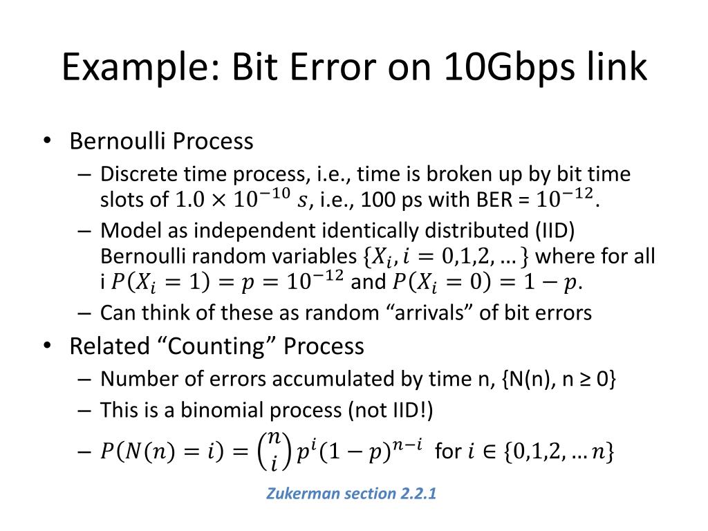 Example: Bit Error on 10Gbps link • Bernoulli Process • Discrete time process, i.e., time is broken up by bit time slots of , i.e., 100 ps with BER = . • Model as independent identically distributed (IID) Bernoulli random variables where for all i and . • Can think of these as random “arrivals” of bit errors • Related “Counting” Process • Number of errors accumulated by time n, {N(n), n ≥ 0} • This is a binomial process (not IID!) • for Zukerman section 2.2.1