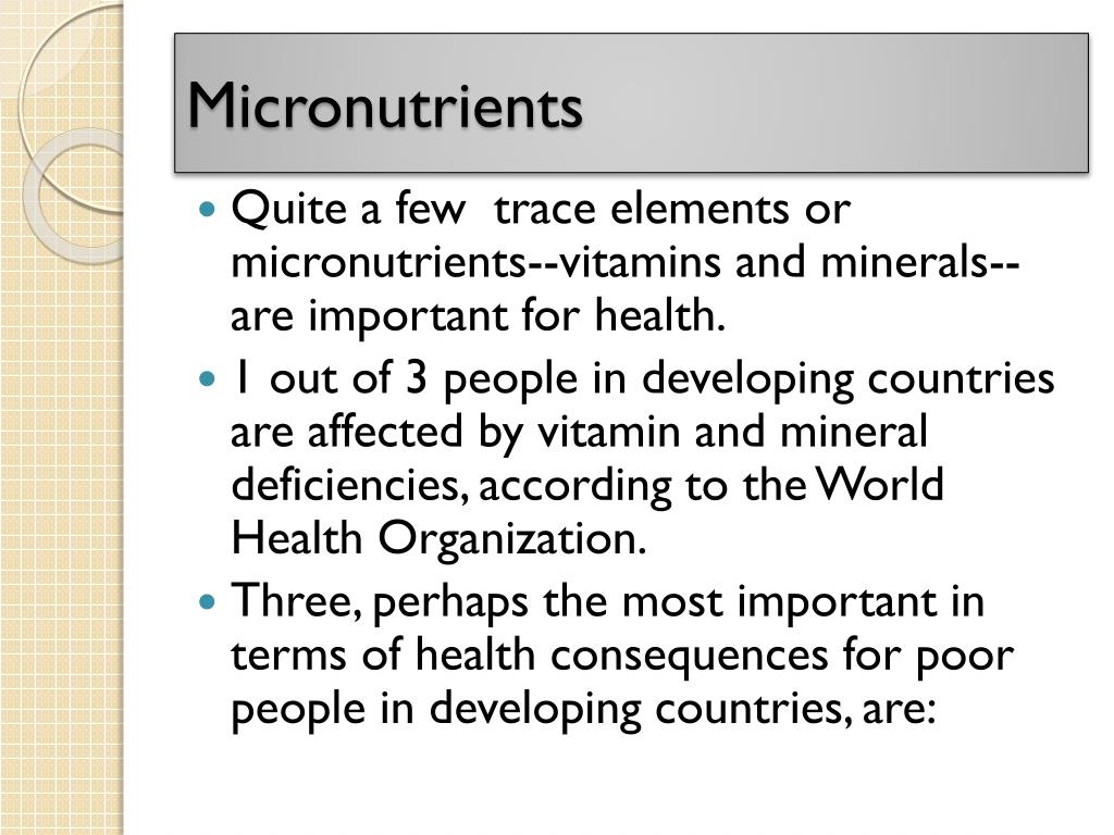 Micronutrients • Quite a few trace elements or micronutrients--vitamins and minerals--are important for health. • 1 out of 3 people in developing countries are affected by vitamin and mineral deficiencies, according to the World Health Organization. • Three, perhaps the most important in terms of health consequences for poor people in developing countries, are: