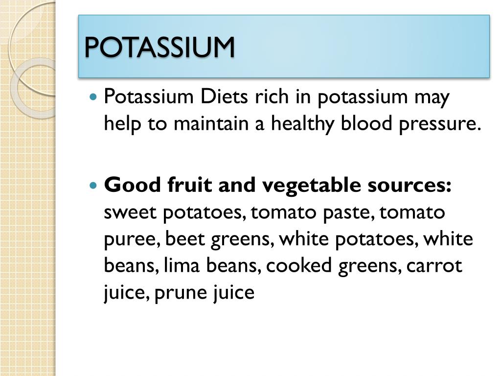 POTASSIUM • Potassium Diets rich in potassium may help to maintain a healthy blood pressure. • Good fruit and vegetable sources: sweet potatoes, tomato paste, tomato puree, beet greens, white potatoes, white beans, lima beans, cooked greens, carrot juice, prune juice