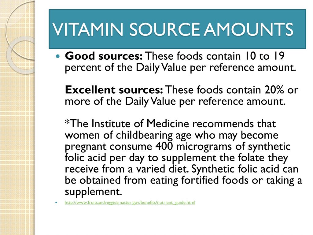VITAMIN SOURCE AMOUNTS • Good sources: These foods contain 10 to 19 percent of the Daily Value per reference amount.Excellent sources: These foods contain 20% or more of the Daily Value per reference amount.*The Institute of Medicine recommends that women of childbearing age who may become pregnant consume 400 micrograms of synthetic folic acid per day to supplement the folate they receive from a varied diet. Synthetic folic acid can be obtained from eating fortified foods or taking a supplement. • http://www.fruitsandveggiesmatter.gov/benefits/nutrient_guide.html