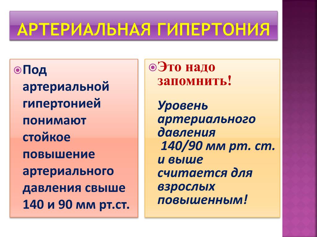 АРТЕРИАЛЬНАЯ ГИПЕРТОНИЯ • Под артериальной гипертонией понимают стойкое повышение артериального давления свыше 140 и 90 мм рт.ст. • Это надо запомнить!Уровень артериального давления 140/90 мм рт. ст. и выше считается для взрослых повышенным!
