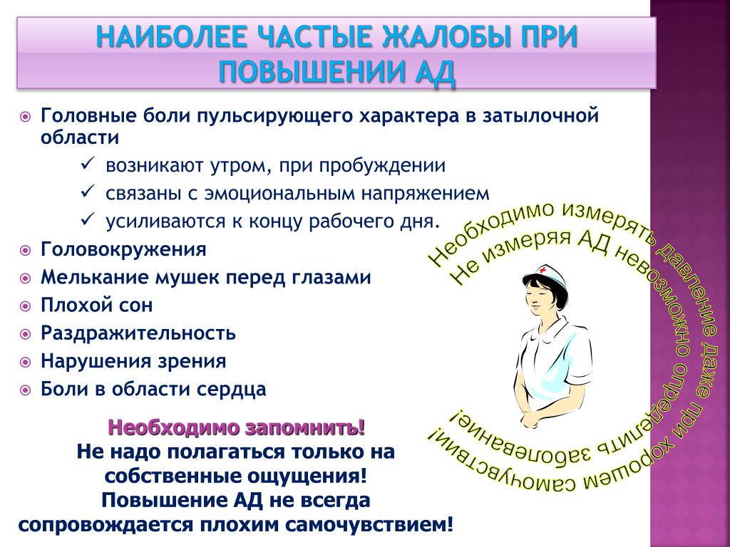 Наиболее частые жалобы при повышении АД • Головные боли пульсирующего характера в затылочной области üвозникают утром, при пробуждении üсвязаны с эмоциональным напряжением üусиливаются к концу рабочего дня. • Головокружения • Мелькание мушек перед глазами • Плохой сон • Раздражительность • Нарушения зрения • Боли в области сердца Необходимо измерять давление даже при хорошем самочувствии! Не измеряя АД невозможно определить заболевание! Необходимо запомнить! Не надо полагаться только на собственные ощущения! Повышение АД не всегда сопровождается плохим самочувствием!