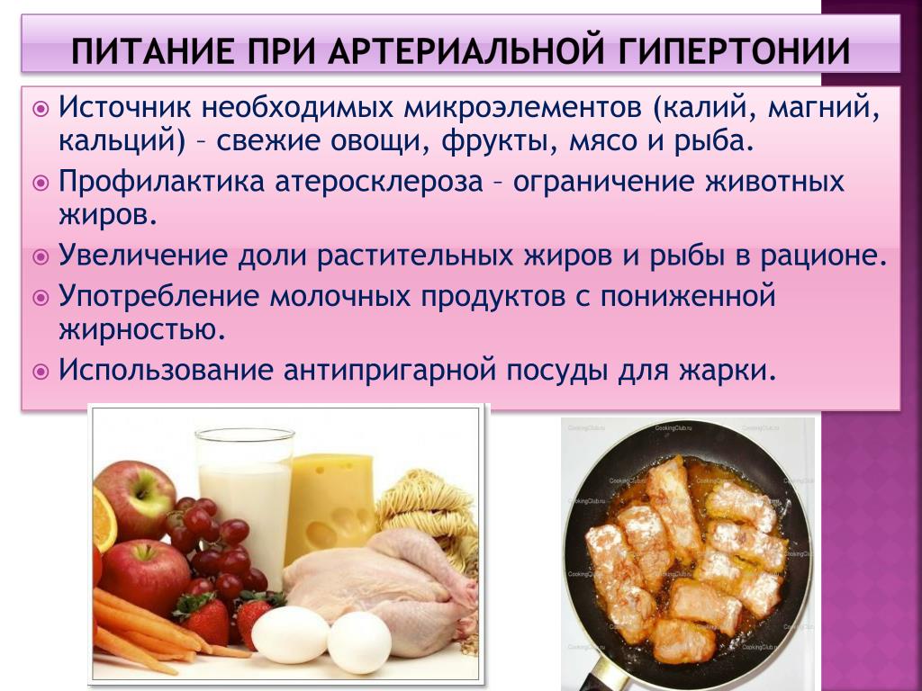 Питание при артериальной гипертонии • Источник необходимых микроэлементов (калий, магний, кальций) – свежие овощи, фрукты, мясо и рыба. • Профилактика атеросклероза – ограничение животных жиров. • Увеличение доли растительных жиров и рыбы в рационе. • Употребление молочных продуктов с пониженной жирностью. • Использование антипригарной посуды для жарки.