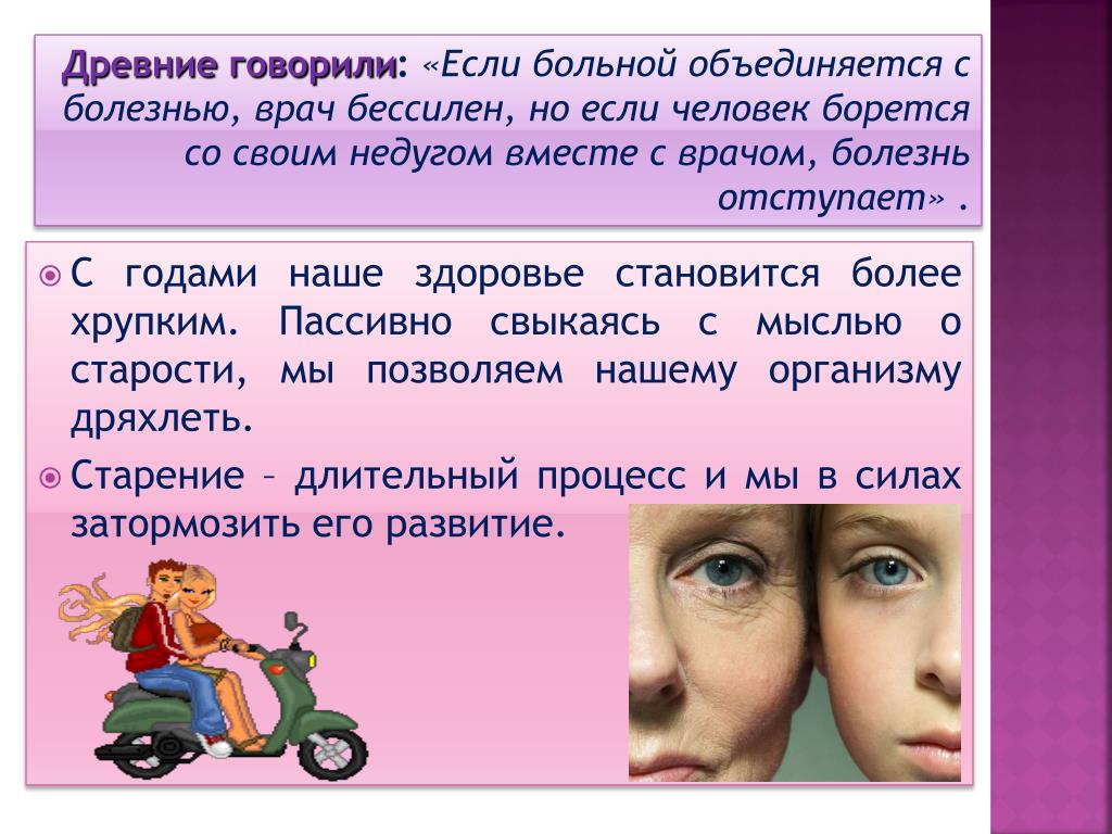 Древние говорили:«Если больной объединяется с болезнью, врач бессилен, но если человек борется со своим недугом вместе с врачом, болезнь отступает» . • С годами наше здоровье становится более хрупким. Пассивно свыкаясь с мыслью о старости, мы позволяем нашему организму дряхлеть. • Старение – длительный процесс и мы в силах затормозить его развитие.