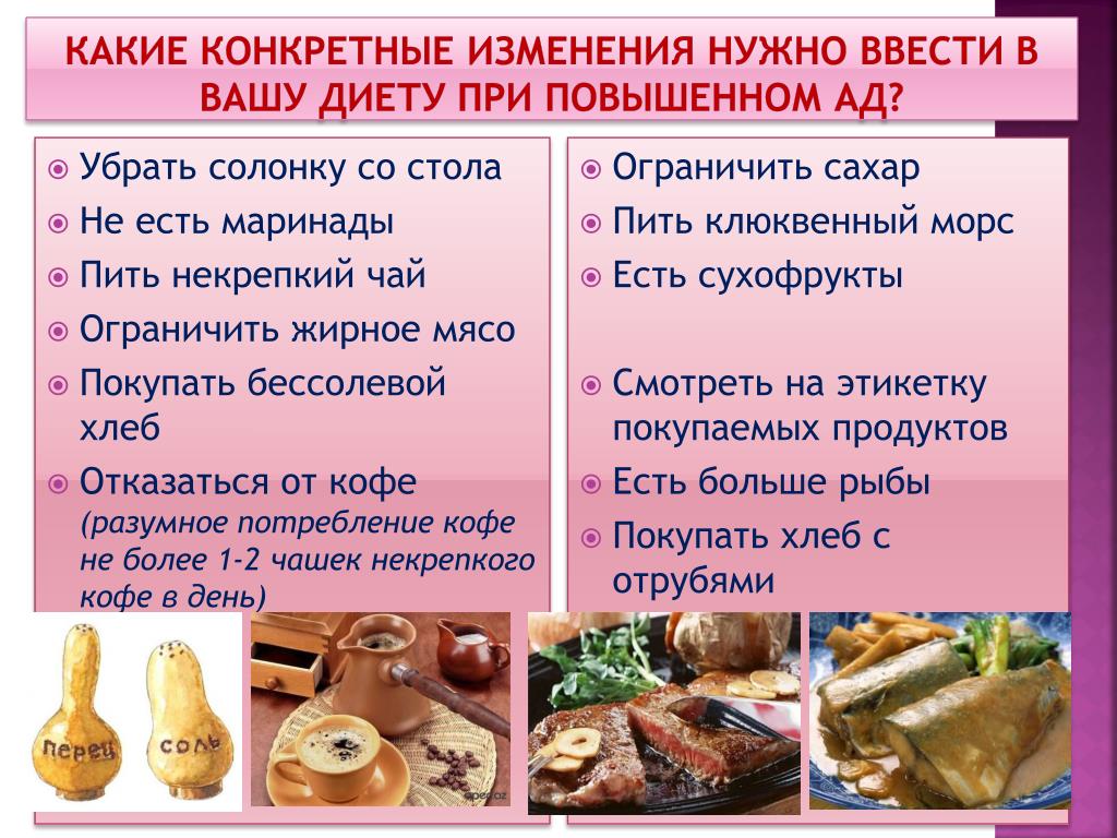 Убрать солонку со стола Не есть маринады Пить некрепкий чай Ограничить жирное мясо Покупать бессолевой хлеб Отказаться от кофе (разумное потребление кофе не более 1-2 чашек некрепкого кофе в день) Ограничить сахар Пить клюквенный морс Есть сухофрукты Смотреть на этикетку покупаемых продуктов Есть больше рыбы Покупать хлеб с отрубями Какие конкретные изменения нужно ввести в вашу диету при повышенном АД? 1 2 3 4