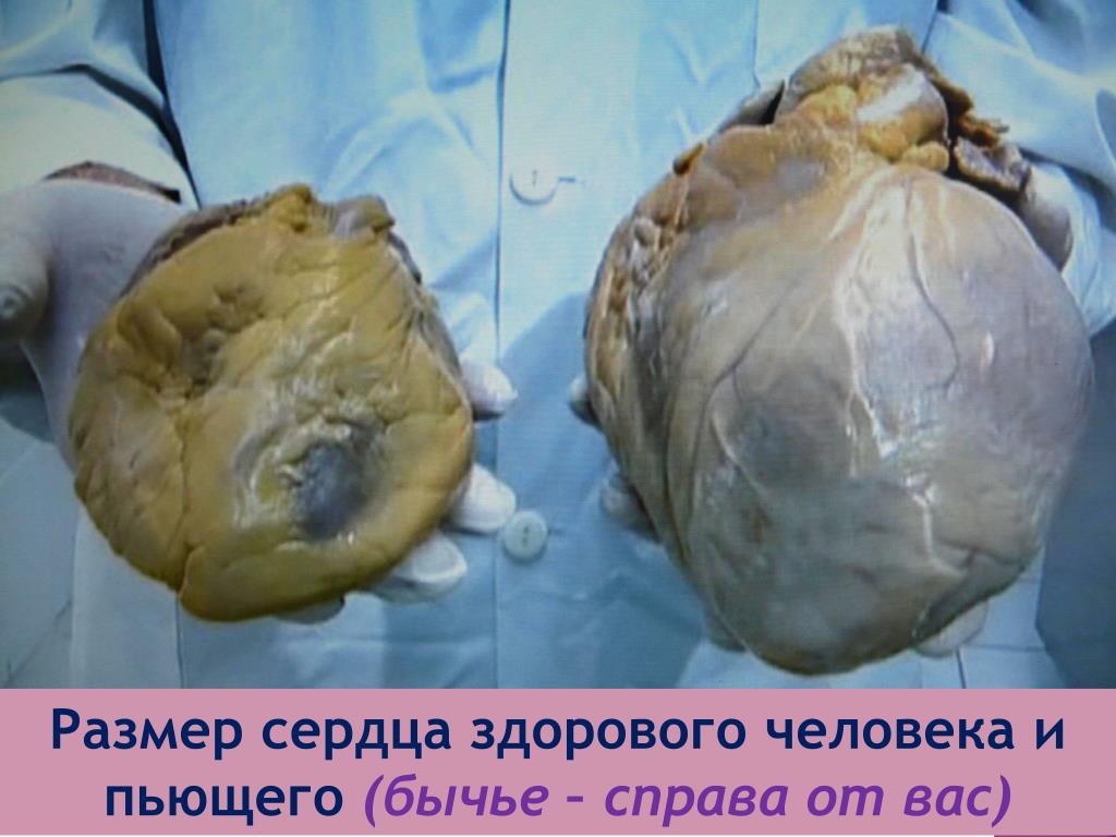 Размер сердца здорового человека и пьющего (бычье – справа от вас)