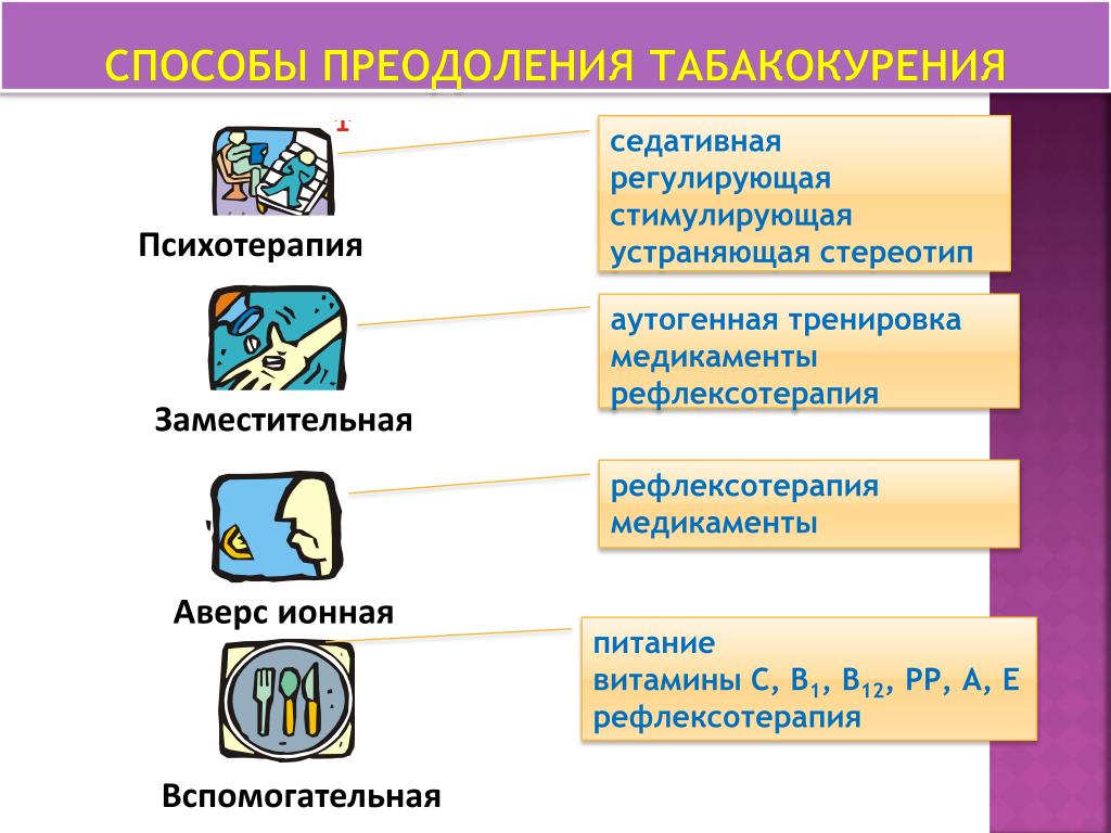 СПОСОБЫ ПРЕОДОЛЕНИЯ ТАБАКОКУРЕНИЯ седативная регулирующая стимулирующая устраняющая стереотип Психотерапия аутогенная тренировка медикаменты рефлексотерапия Заместительная рефлексотерапия медикаменты Аверс ионная питание витамины С, В1, В12, РР, А, Е рефлексотерапия Вспомогательная