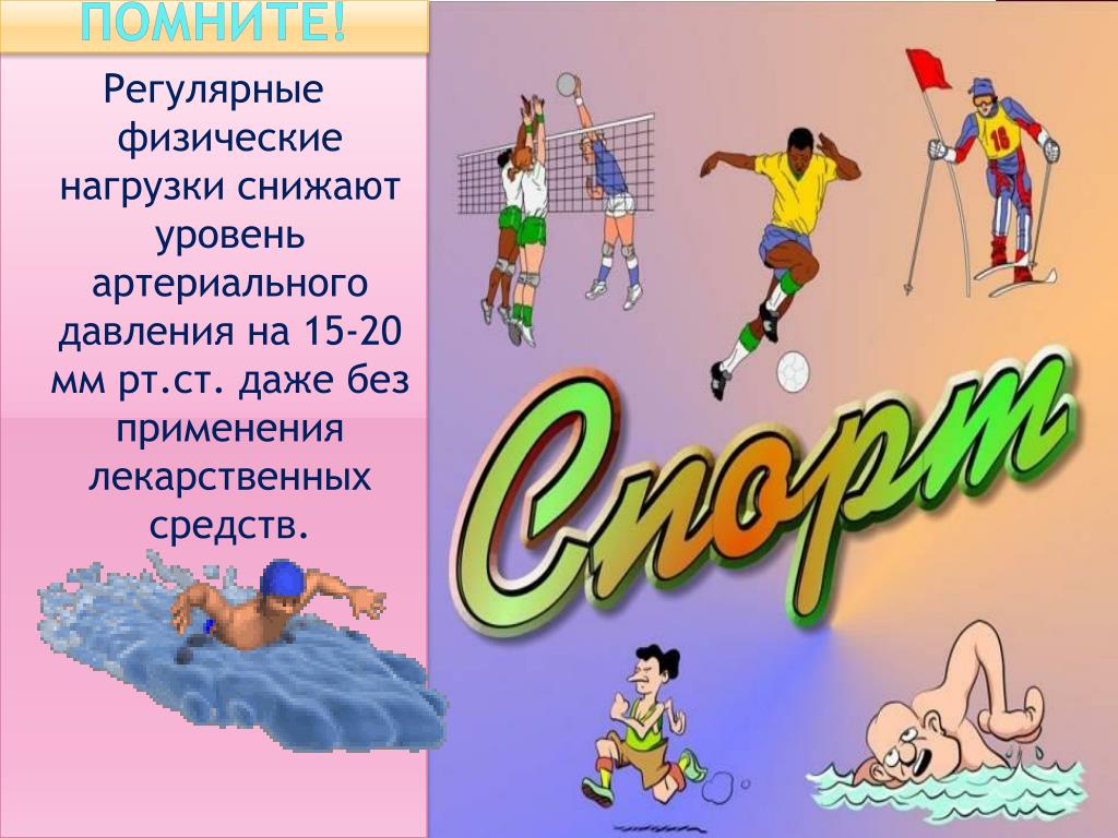 ПОМНИТЕ! Регулярные физические нагрузки снижают уровень артериального давления на 15-20 мм рт.ст. даже без применения лекарственных средств.