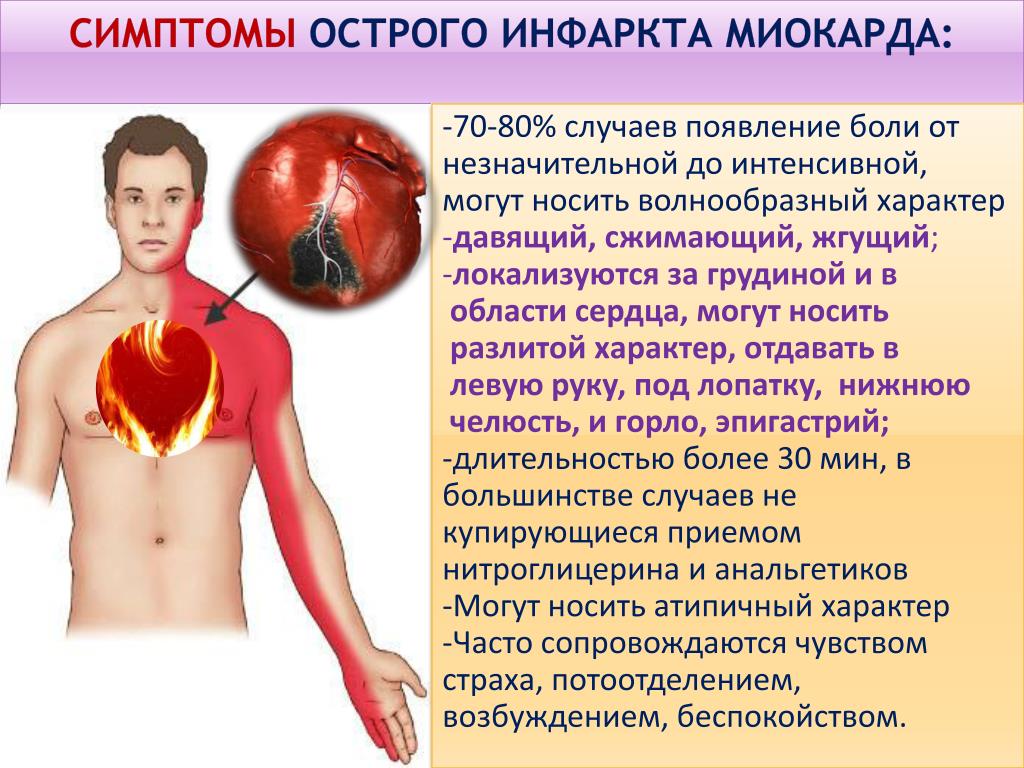 Симптомы острого инфаркта миокарда: • 70-80% случаев появление боли от незначительной до интенсивной, могут носить волнообразный характер • давящий, сжимающий, жгущий; • локализуются за грудиной и в • области сердца, могут носить • разлитой характер, отдавать в • левую руку, под лопатку, нижнюю • челюсть, и горло, эпигастрий; • длительностью более 30 мин, в большинстве случаев не купирующиеся приемом нитроглицерина и анальгетиков • Могут носить атипичный характер • Часто сопровождаются чувством страха, потоотделением, возбуждением, беспокойством.