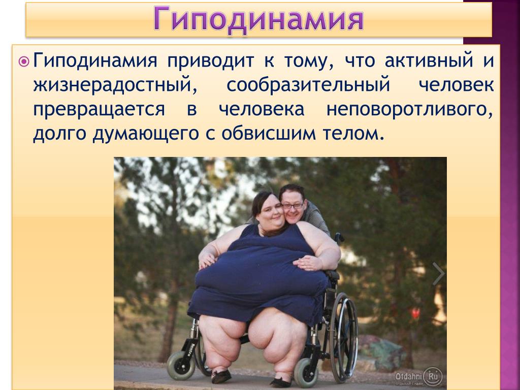 Гиподинамия • Гиподинамия приводит к тому, что активный и жизнерадостный, сообразительный человек превращается в человека неповоротливого, долго думающего с обвисшим телом.
