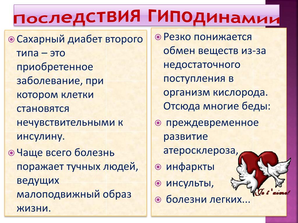 Последствия гиподинамии • Резко понижается обмен веществ из-за недостаточного поступления в организм кислорода. Отсюда многие беды: • преждевременное развитие атеросклероза, • инфаркты • инсульты, • болезни легких... • Сахарный диабет второго типа – это приобретенное заболевание, при котором клетки становятся нечувствительными к инсулину. • Чаще всего болезнь поражает тучных людей, ведущих малоподвижный образ жизни.
