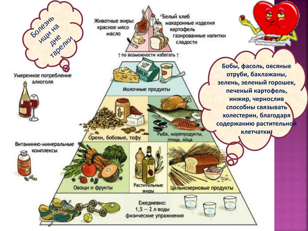 Болезнь ищи на дне тарелки Бобы, фасоль, овсяные отруби, баклажаны, зелень, зеленый горошек, печеный картофель, инжир, чернослив способны связывать холестерин, благодаря содержанию растительной клетчатки.