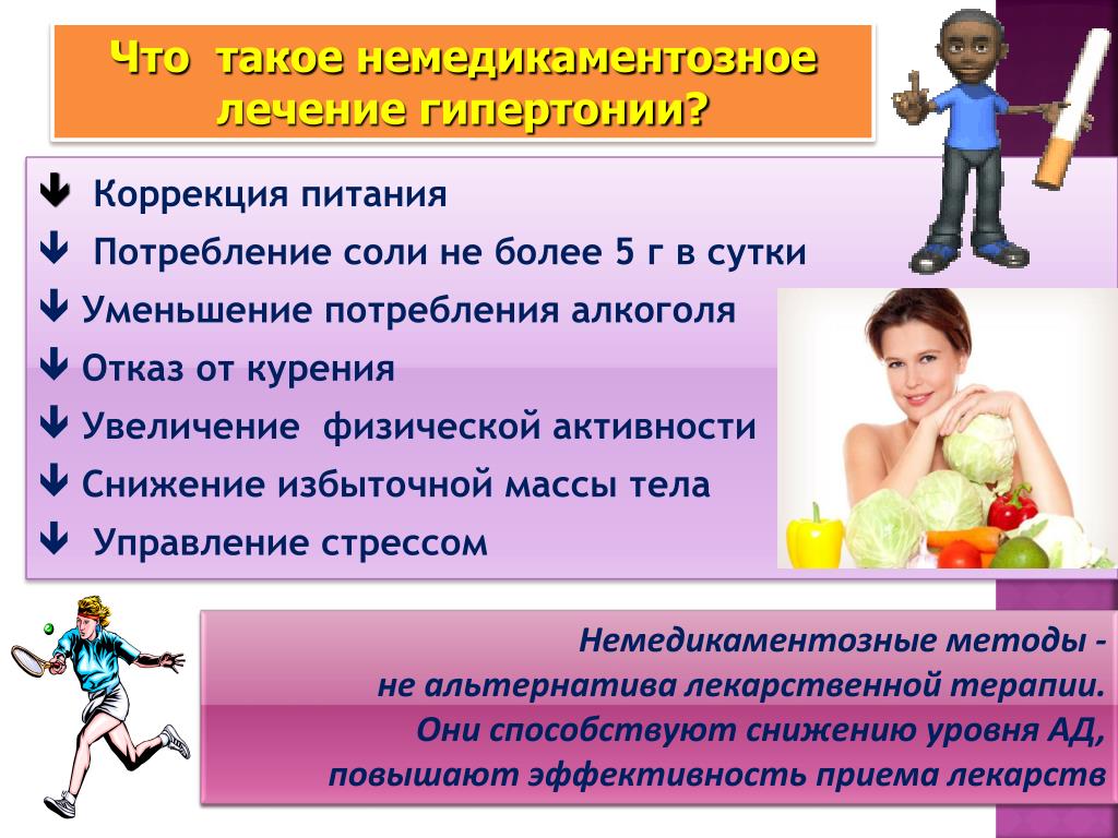 Что такое немедикаментозное лечение гипертонии? • Коррекция питания • Потребление соли не более 5 г в сутки • Уменьшение потребления алкоголя • Отказ от курения • Увеличение физической активности • Снижение избыточной массы тела • Управление стрессом Немедикаментозные методы - не альтернатива лекарственной терапии. Они способствуют снижению уровня АД, повышают эффективность приема лекарств