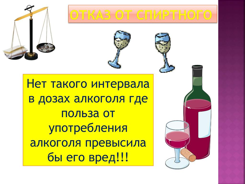 Отказ от спиртного Нет такого интервала в дозах алкоголя где польза от употребления алкоголя превысила бы его вред!!!
