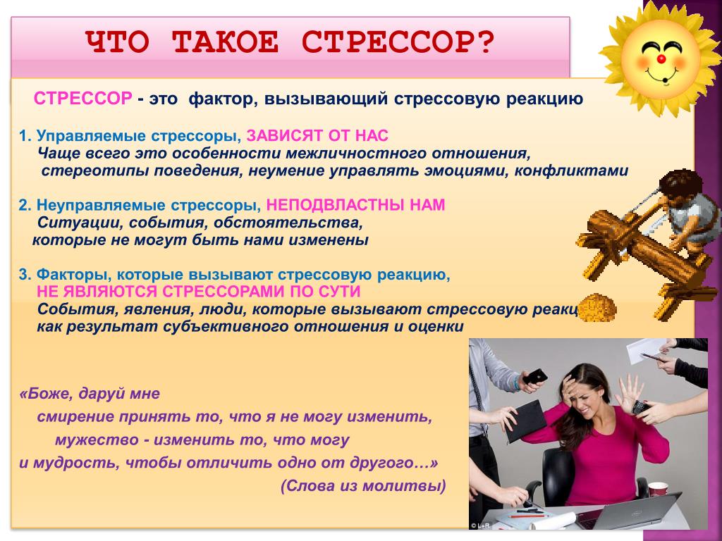 Что такое стрессор? СТРЕССОР - это фактор, вызывающий стрессовую реакцию 1. Управляемые стрессоры, ЗАВИСЯТ ОТ НАС Чаще всего это особенности межличностного отношения, стереотипы поведения, неумение управлять эмоциями, конфликтами 2. Неуправляемые стрессоры, НЕПОДВЛАСТНЫ НАМ Ситуации, события, обстоятельства, которые не могут быть нами изменены 3. Факторы, которые вызывают стрессовую реакцию, не являются стрессорами по сути События, явления, люди, которые вызывают стрессовую реакцию, как результат субъективного отношения и оценки «Боже, даруй мне смирение принять то, что я не могу изменить, мужество - изменить то, что могу и мудрость, чтобы отличить одно от другого…» (Слова из молитвы)
