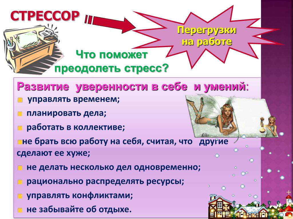 СТРЕССОР Перегрузки на работе Что поможет преодолеть стресс? • Развитие уверенности в себе и умений: • управлять временем; • планировать дела; • работать в коллективе; • не брать всю работу на себя, считая, что другие сделают ее хуже; • не делать несколько дел одновременно; • рационально распределять ресурсы; • управлять конфликтами; • не забывайте об отдыхе.