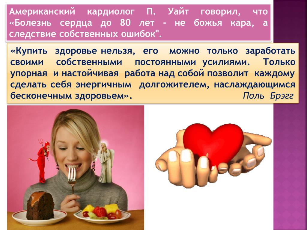 Американский кардиолог П. Уайт говорил, что «Болезнь сердца до 80 лет - не божья кара, а следствие собственных ошибок". «Купить здоровье нельзя, его можно только заработать своими собственными постоянными усилиями. Только упорная и настойчивая работа над собой позволит каждому сделать себя энергичным долгожителем, наслаждающимся бесконечным здоровьем». Поль Брэгг