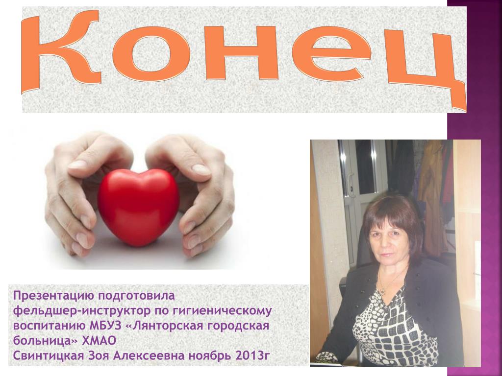 Конец Презентацию подготовилафельдшер-инструктор по гигиеническому воспитанию МБУЗ «Лянторская городская больница» ХМАОСвинтицкая Зоя Алексеевна ноябрь 2013г