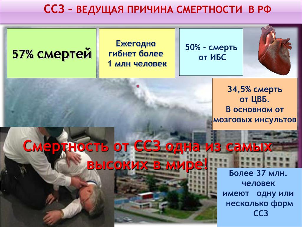 ССЗ – ВЕДУЩАЯ ПРИЧИНА СМЕРТНОСТИ В РФ • Ежегодно сердечно-сосудистые заболевания уносят жизни миллионов людей во всём мире. • Показатели смертности от этих заболеваний в России намного выше, чем в развитых странах. • Средняя продолжительность жизни населения России около 66 лет. Мужчины в среднем живут 59 лет, женщины – 72 года.