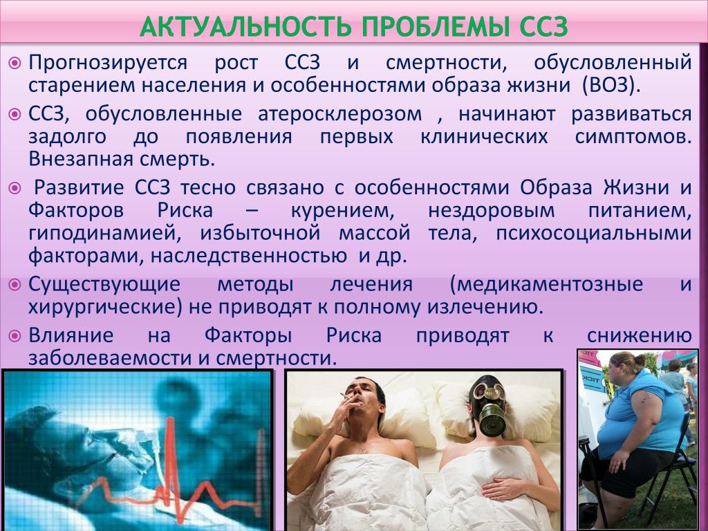 АКТУАЛЬНОСТЬ ПРОБЛЕМЫ ССЗ • Прогнозируется рост ССЗ и смертности, обусловленный старением населения и особенностями образа жизни (ВОЗ). • ССЗ, обусловленные атеросклерозом , начинают развиваться задолго до появления первых клинических симптомов. Внезапная смерть. • Развитие ССЗ тесно связано с особенностями Образа Жизни и Факторов Риска – курением, нездоровым питанием, гиподинамией, избыточной массой тела, психосоциальными факторами, наследственностью и др. • Существующие методы лечения (медикаментозные и хирургические) не приводят к полному излечению. • Влияние на Факторы Риска приводят к снижению заболеваемости и смертности.