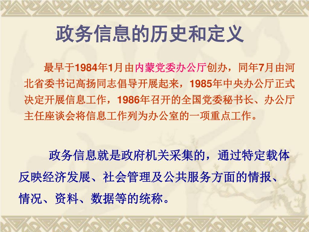 政务信息培训讲义. 湖州师范学院传播系 杨 晓. 政务信息的历史和定义. 最早于 1984 年 1 月由 内蒙党委办公厅 创办,同年 7 月由河北省委书记高扬同志倡导开展起来, 1985 年中央办公厅正式决定开展信息工作, 1986 年召开的全国党委秘书长、办公厅主任座谈会将信息工作列为办公室的一项重点工作。. 政务信息就是政府机关采集的,通过特定载体反映经济发展、社会管理及公共服务方面的情报、情况、资料、数据等的统称。. 政务信息的 基本定位. 定位之一:下情上达、上情下达。 定位之二:宣传工作,展示自我。