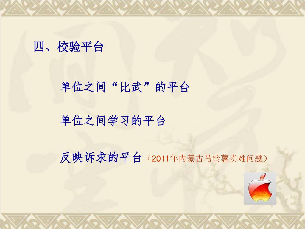 四、校验平台 单位之间“比武”的平台 单位之间学习的平台 反映诉求的平台(2011年内蒙古马铃薯卖难问题)