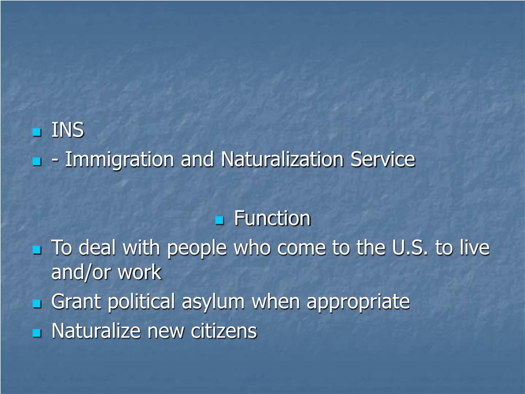 INS • - Immigration and Naturalization Service • Function • To deal with people who come to the U.S. to live and/or work • Grant political asylum when appropriate • Naturalize new citizens