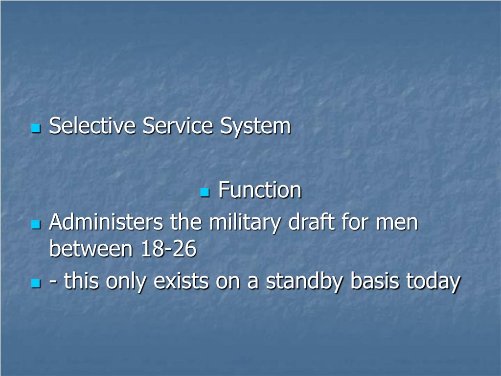 Selective Service System • Function • Administers the military draft for men between 18-26 • - this only exists on a standby basis today