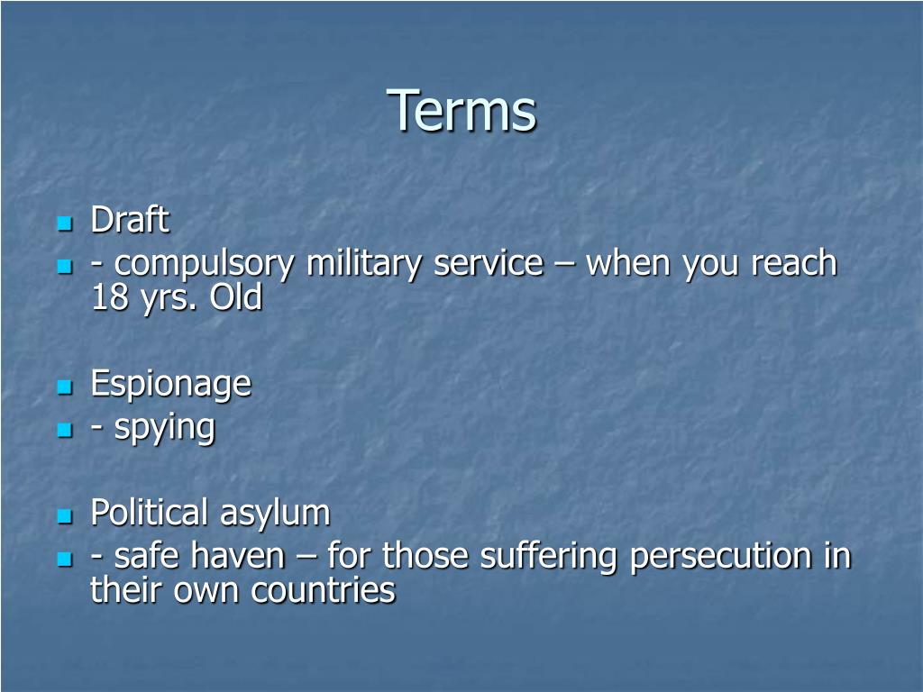 Terms • Draft • - compulsory military service – when you reach 18 yrs. Old • Espionage • - spying • Political asylum • - safe haven – for those suffering persecution in their own countries