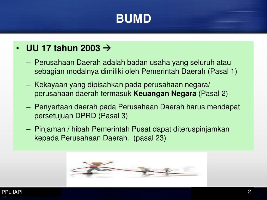 BUMD • UU 17 tahun 2003 • Perusahaan Daerah adalahbadanusaha yang seluruhatausebagianmodalnyadimilikiolehPemerintahDaerah (Pasal 1) • Kekayaan yang dipisahkanpadaperusahaannegara/ perusahaandaerah termasuk Keuangan Negara (Pasal 2) • Penyertaan daerah pada Perusahaan Daerah harus mendapat persetujuan DPRD (Pasal 3) • Pinjaman / hibah Pemerintah Pusat dapat diteruspinjamkan kepada Perusahaan Daerah. (pasal 23)